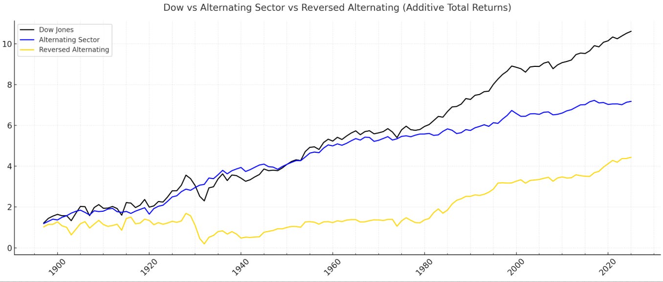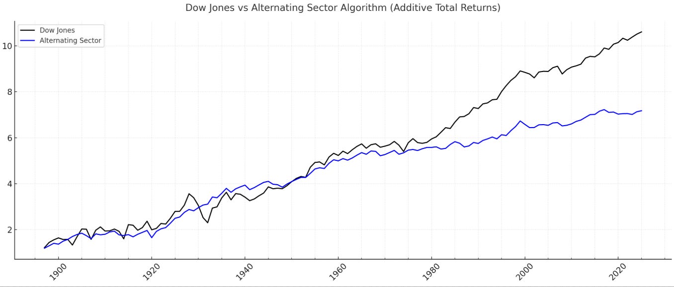 When applied to the full dataset from 1897 through 2025, the reversed strategy showed inferior long-term performance compared to both the Dow and the original Alternating Sector Algorithm.