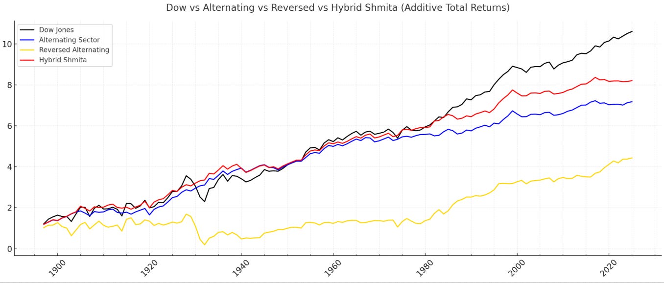 Building on both the original and reversed alternating strategies, we explored a third approach inspired by the Torah’s Shmita principle. In the Torah, every seventh year is set aside as a “Sabbatical year” (Shmita) — a period of rest and release. Applying this concept to the market-timing model, the Hybrid Shmita Algorithm follows the original alternating sector strategy, but every seventh year, the signals are reversed for that year alone, before reverting to the base logic in the following year.