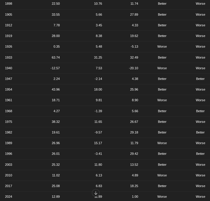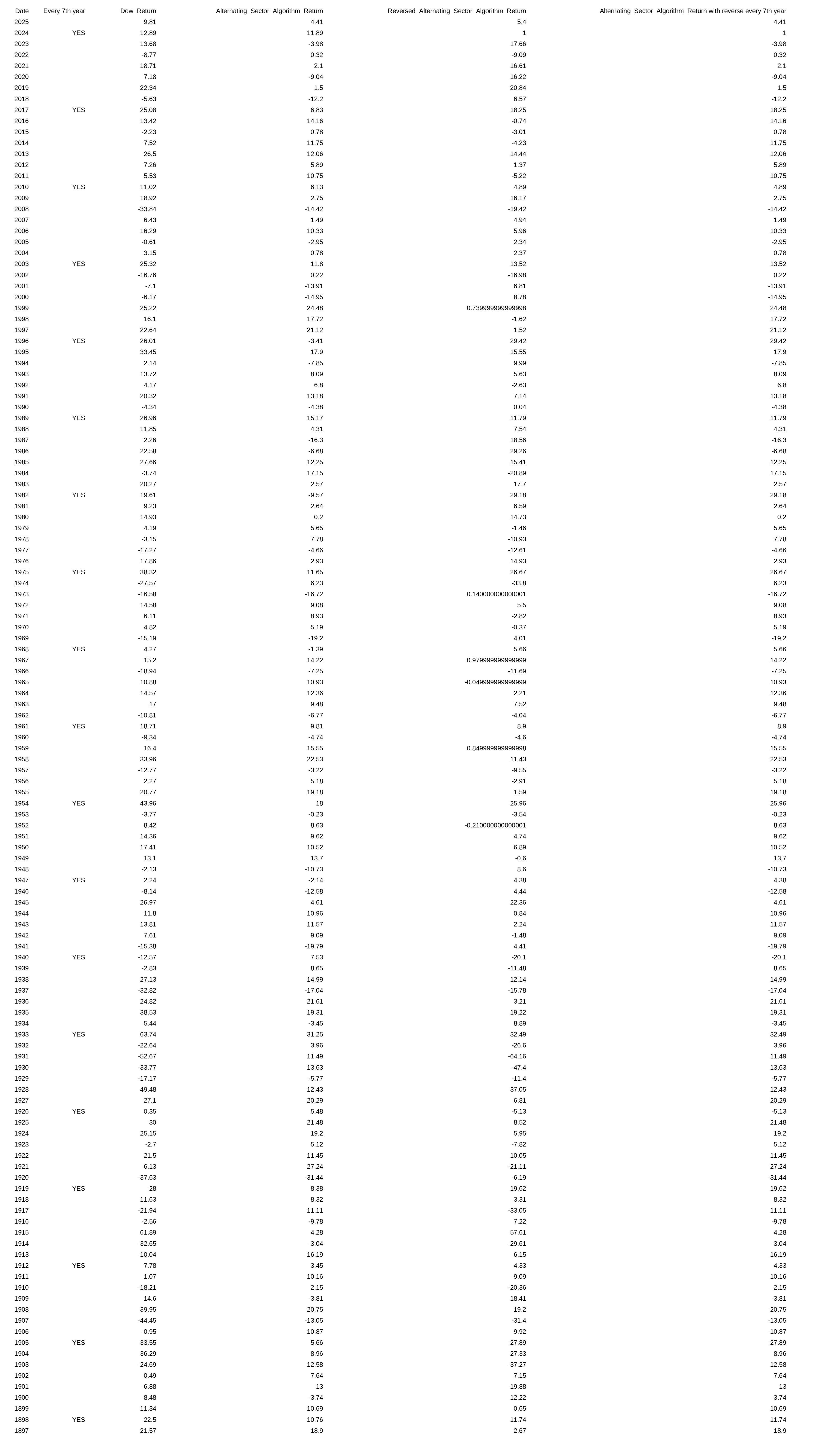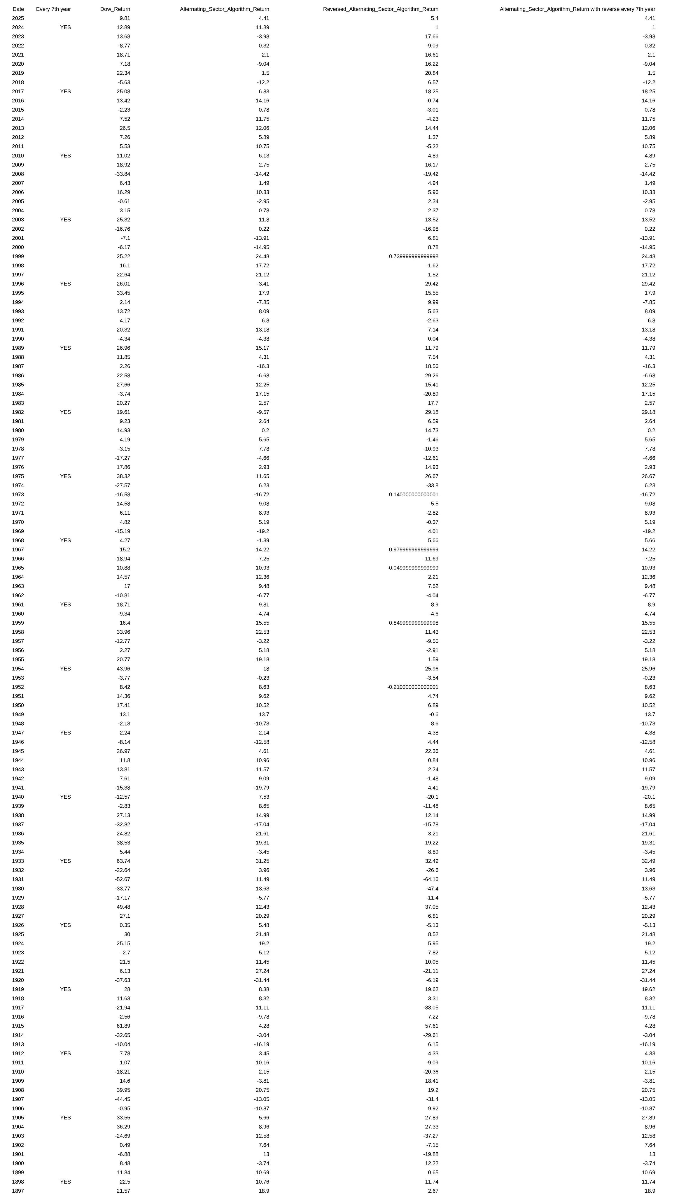To evaluate the long-term effectiveness of the Alternating Sector Algorithm, we constructed a historical dataset of annual Dow Jones Industrial Average performance spanning 1897 through 2025. This dataset includes each year’s percentage change in the Dow, providing a clean baseline for buy-and-hold performance over more than a century of bull markets, crashes, wars, recessions, and technological booms.